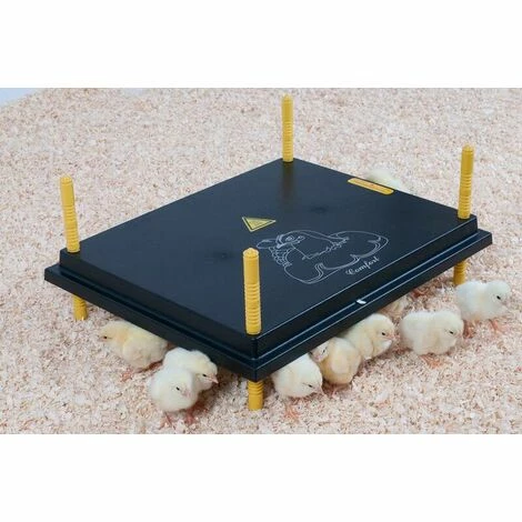 Avec cette plaque chauffante, vous pouvez garder ± 15-20 poussins bien au chaud. Le système est placé sur une élévation pratique pour que les poussins puissent se blottir en dessous.