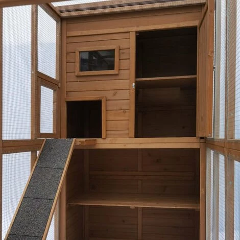L’enceinte est conçue dans un beau bois de sapin lasuré et séché au four (technique pour que le bois soit plus résistant à l’humidité et aux moisissures). La structure est munie d’un grillage en acier galvanisé ainsi que d’un toit en feutre bitumé, résistant aux intempéries.