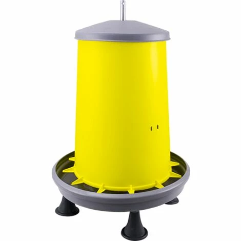 Mangeoire pour volailles à trémie en plastique de la marque River Systems. Modèle équipé de pieds. Matière : plastique et métal Couleurs : jaune et gris Dimensions : Hauteur 50 x Diamètre 40 cm Contenance : 15Kg Tige en métal à niveau réglable Bordure anti-gaspillage Couvercle amovible Trou de suspension 4 pieds Marque : River Systems.