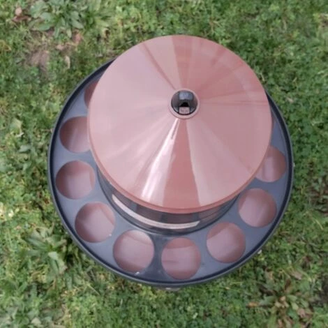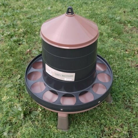 Mangeoire pour volailles avec 4 pieds et un grand réservoir en plastique recyclé. Contenance : 12Kg. Couleurs aléatoires : violet aubergine, gris anthracite, vert foncé ou bleu nuit. Gamme : Eco..