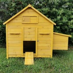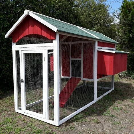 Découvrez le Deluxe : un poulailler coloré, robuste, pratique et ergonomique qui pourra accueillir jusqu’à douze poules dans des conditions idéales ! Un abri très chic pour vos petites poules Ses façades rouges et blanches associées à son toit vert bouteille donnent une allure singulièrement au Deluxe, un poulailler que l’on remarque ! Bien installé dans votre jardin, il deviendra, c’est certain, un élément important de votre décoration extérieure. En plus, bien sûr, d’offrir un cadre de vie chaleureux à vos volailles. Un poulailler bien pensé en bois de qualité Esthétique, le Deluxe n’en est pas moins solide et robuste. Sa structure à monter soi-même est composée de panneaux de bois épais de 10 mm d’épaisseur reposant sur des montants de 25 par 30 mm. Et depuis août 2020, il est équipé d’une visserie en acier bichromaté qui résiste mieux à l’oxydation. Son parc est constitué de grillage traité pour résister à la rouille et ce poulailler est pensé pour le bien-être des poules, mais aussi le vôtre. Ainsi, un tiroir à déjections en métal simplifie grandement la corvée de nettoyage. Une partie nuit bien isolée avec toiture en shingle La grande toiture qui couvre l’ensemble de la structure est en double pente, ce qui améliore l’écoulement de l’eau de pluie. Elle est recouverte de shingle, bardeau bitumé et gravillonné parfaitement étanche, matière que l’on retrouve souvent sur les abris de jardin par exemple. La partie nuit située en hauteur est bien isolée. Elle est en effet éloignée du sol et de son humidité. Vos poules y accèderont à l’aide d’une rampe en bois et trouveront à l’intérieur deux perchoirs ainsi que deux pondoirs. Une maison à volailles équipée de deux pondoirs Les deux pondoirs sont divisés en 4 nichoirs et pourront recevoir un nombre important de pondeuses qui se relaieront pour y pondre. Avec 8 nichoirs en tout votre poulailler pourra atteindre une capacité de douze bêtes. Ces pondoirs, eux-aussi recouverts de shingle, sont accessibles de l’extérieur, ce qui facilitera votre récolte d’œufs quotidienne. Un parc grillagé pratique et sécurisé Il offrira un espace de liberté en plein air à vos animaux, qui pourront s’y déplacer en toute sécurité. Ils s’en donneront à cœur joie et gratteront le sol, prendront des bains de poussière sans avoir à se soucier d’éventuels prédateurs. Sous la partie nuit, l’espace au sol sera lui aussi investit par vos amies à plumes. Un modèle dont vous pourrez facilement compléter l’équipement Le Deluxe possède déjà de nombreux accessoires. Mais vous pourrez vous-même le compléter en ajoutant une extension de son parc grillagé (réf : C6012RUN) et agrandir ainsi l’espace de liberté de vos poules. Disposez une trappe en métal taille S (réf : HS-trappe) actionnée par un portier automatique à l’entrée de la partie nuit. Ce système ouvrira et fermera la maison de vos poules selon les horaires que vous aurez choisis et elle sera de ce fait encore mieux protégée. Pour terminer, une bâche de protection contre la pluie et le vent conçue pour le poulailler Deluxe (réf : 466H) pourra s’avérer très pratique. Munie de nombreuses ouvertures placées aux bons endroits, elle vous permettra d’accéder aux portes et pondoirs tout en protégeant vos animaux des intempéries. Modèle également disponible avec un toit noir (réf : 466RBlack).