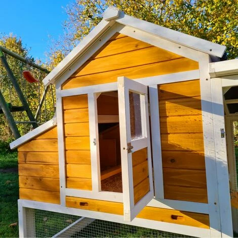 Installez confortablement jusqu’à 8 poules dans ce très joli poulailler, pratique et esthétique. Il est muni d’un parc grillagé et son toit est en plastique ondulé, matière parfaitement étanche. Un poulailler coloré très design Le jaune doré et le blanc de ses façades offrent un contraste important avec le gris anthracite de son toit et son dessin n’est pas sans rappeler le design scandinave. Ses lignes simples et ses couleurs chaudes évoquent en effet des photos de villes et villages suédois ou norvégiens. Son aspect très déco en fera une pièce de choix dans votre jardin. Notez que les plus jeunes, tout comme les plus âgés d’ailleurs, seront enchantés de pouvoir observer des poules dans leur environnement grâce aux larges panneaux grillagés. Accueillez jusqu’à 8 poules dans cette maisonnette très pratique En plus d’être très joli, le Toit Renforcé est aussi bien conçu. Robuste, il est constitué de panneaux de bois à assembler d’une épaisseur de 12 mm, gage de qualité et de durabilité. Ses montants font quant à eux 25 x 30 mm. Son grillagé est en métal galvanisé, préservé de la rouille. Le tiroir à déjections, très pratique pour l’entretien du poulailler, est également en métal galvanisé. Placée en hauteur, la partie nuit est ainsi mieux isolée du froid et de l’humidité du sol. Vos poules y grimperont à l’aide d’une rampe en bois et trouveront à l’intérieur deux perchoirs ainsi qu’un pondoir séparé en trois accessible de l’extérieur. Du plastique ondulé pour une toiture totalement étanche L’abri à volailles est couvert de plusieurs toitures à débords, toutes en pentes afin de rendre l’écoulement de l’eau de pluie plus facile. Le plastique ondulé qui a été choisi est parfaitement étanche et gardera vos petites protégées bien au sec. Des volailles plus libres avec un parc grillagé Vos pondeuses pourront prendre l’air, gratter et picorer le sol à loisir grâce au parc grillagé intégré au Toit Renforcé. Elles y seront à l’abri de la pluie et des intempéries, mais aussi de toute intrusion. Elles investiront aussi la place libérée au sol par le placement en hauteur de la partie nuit. Vous complèterez idéalement votre installation avec un filet ou un grillage à poules qui sécurisera les abords du poulailler afin de proposer à vos bêtes une zone protégée plus importante. Elles pourront y suivre leur parcours quotidien.