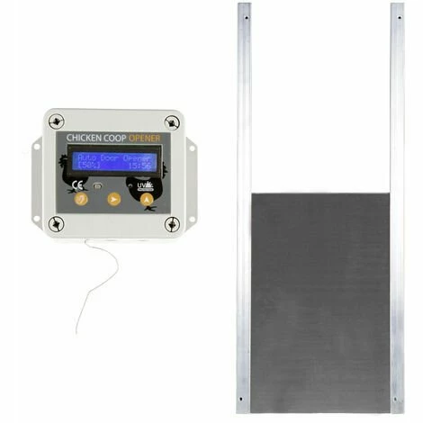 Découvrez le portier automatique pour poulailler afin de protéger vos poules et évitez le chant du coq très tôt le matin ! Deux modes de programmation sont possibles et peuvent être combinés : Minuterie réglable à une heure donnée Capteur de lumière Interface retro-éclairée d’où vous pourrez y configurer les paramètres selon vos préférences à travers le menu. Le capteur de lumière déclenche l’ouverture de la trappe après 6 secondes en contact avec la lumière afin d’éviter l’ouverture involontaire de la porte à cause des feux de véhicules ou autre. Le boîtier est relié à un câble qui descend et remonte automatiquement toute trappe coulissante entre 0.2 et 1 kg. Facile à installer, il suffit de fixer le boîtier sur le poulailler et de lier au cordon la trappe. Simple d’utilisation et contrôlable manuellement, le boîtier est étanche. La trappe pour poulailler permet quant à elle d’assurer la sécurité et la protection de vos poules. Conçue contre les prédateurs, cette trappe est légère afin de glisser parfaitement pour l’ouverture et la fermeture de la porte. Ainsi elle permet d’économiser la durée de vie des piles et de votre portier. Simple d’installation et d’utilisation, il vous suffit de fixer les rails de guidages sur votre poulailler ! Caractéristiques Porte : 22 cm x 33 cm Glissières : 60 cm Capacité de levage de la porte : 1 kg Boîtier : 14 cm x 7 cm x 10 cm Alimenté par 4 piles AA (non incluses).