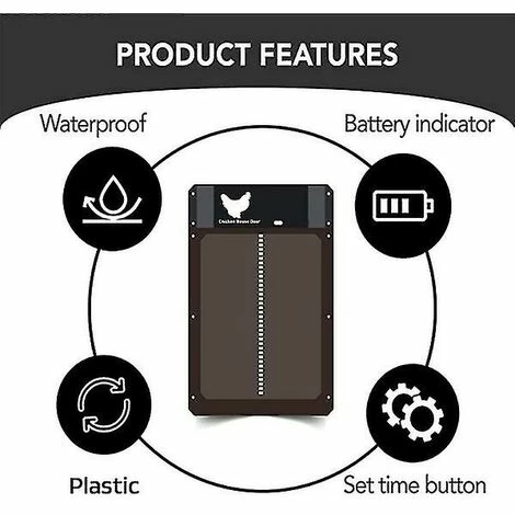 Nom: Porte de poulailler automatique sensible la lumireMatriel: PlastiqueBatterie: 3 piles AA (sans piles)Aimant: Le moteur contient du magntismeFonction: perception de la lumire, soulevable, tanche (IP44)Taille: 35x24x3.7cmCouleur: brun noirEmballage inclus: 1 * Porte automatique de poulailler sensible la lumireNote: 1. Veuillez autoriser une diffrence de 1 3 cm (0,4 1,18 po) en raison de la mesure manuelle et dune lgre variation de couleur pour diffrents paramtres daffichage.2. En raison de la diffrence de lumire et d’cran, la couleur de l’lment peut tre lgrement diffrente des images. Veuillez comprendre.* Conception lgre: la porte automatique ultime pour chaque leveur de pouletCe porte automatique de poulailler vous surprend par sa fonction tanche, son design robuste, son capteur de lumire, son interface utilisateur simple et surtout son capteur de lumire, vous permettant de vous dplacer librement la nuit et le jour.* Robuste et durable: adapt aux intempries extrmes et impermable leau; fonctionnera dans la neige, la pluie et la poussire de -15F 140F (-26C 60C), et peut rsister des tempratures leves et basses.* Facile utiliser: Il faut moins de 10 minutes pour installer la porte (aucun cblage compliqu ou cblage requis). Boutons faciles programmer. Vous pouvez rgler une minuterie ou utiliser un capteur de lumire intgr (LUX).* Facile utiliser : vous pouvez utiliser le bouton de test pour rgler une minuterie ouverte.