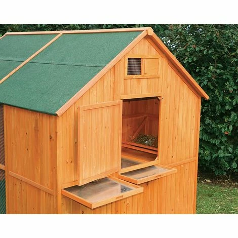 Très grand poulailler volière conçu à la fois pour apporter un maximum de confort aux poules et à leur propriétaire ! Pour les poules : Abri spacieux équipé d’un pondoir et de perchoirs, vaste volière protégée des courants d’air, accès au jardin par la trappe de sortie, aération réglable. Pour le propriétaire : Nettoyage facile et en hauteur de l’abri (tiroirs à déjections), volière haute, plus besoin de se plier en deux pour rendre visite à ses poules, trappes coulissantes équipables de portier électronique (en option), et surtout nouveau concept de pondoir interne à basculement qui facilite et sécurise le ramassage des œufs. Une porte de visite à l’arrière donne accès à l’abri. En bois teinté, toiture en toile goudronnée, livré en kit, assemblage facile.
