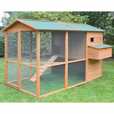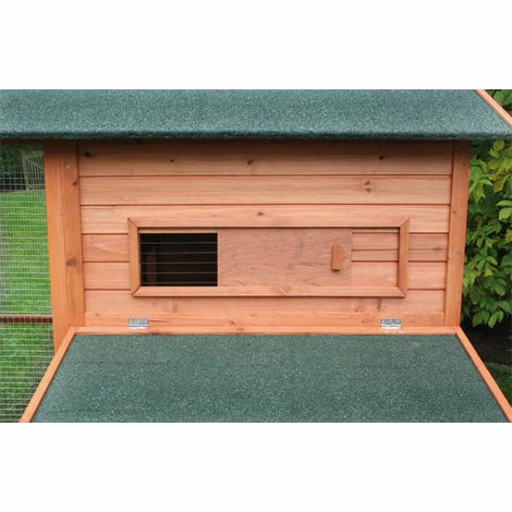 Grand poulailler d’extérieur parfaitement équipé. En bois traité, il convient pour un parquet de poules naines ou de grande race. De tout confort, il comprend une volière couverte avec perchoir, un abri avec 2 perchoirs et 2 trappes de ventilation coulissantes et un pondoir à 3 compartiments. Très pratique, il possède un grand tiroir de nettoyage en tôle galvanisée et de nombreux accès : une porte pour la volière, une trappe coulissante pour l’accès des poules à l’abri, une grande porte dans la volière et une sur l’arrière pour l’accès à l’abri pour le nettoyage ou le contrôle des animaux. De plus, le pondoir est accessible de l’extérieur pour pouvoir ramasser les oeufs sans affoler les poules. Toiture en toile goudronnée. Grillage maille soudée 25 x 25 mm. Livré en kit.