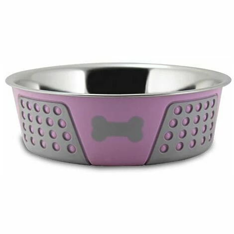 inoxydable et sont recouvertes de plastique et de caoutchouc à l’extérieur. Ces matériaux se combinent entre eux dans des couleurs différentes et sont décorés avec la silhouette d’un os. La base est entièrement recouverte de caoutchouc, ce qui la rend très stable et antidérapante, l’acier inoxydable est un matériau très résistant, hygiénique et facile à nettoyer. Ce modèle de mangeoires est disponible en 3 couleurs différentes avec 3 capacités différentes par couleur.