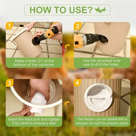 MANGEOIRE POULES ANTI NUISIBLE: Nos mangeoire poules exterieur diy sont conçues pour être de la plus haute qualité, sans danger pour les aliments, résistantes au gel et étanches. Avec un anneau en caoutchouc solidement fixé et une conception de joint de bouchon, cette distributeur eau poule garde les aliments au sec même les jours de pluie, et lorsque la nuit tombe, le port d’alimentation du bouchon protège votre alimentation des rongeurs et des parasites.