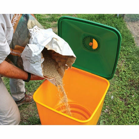 La mangeoire volailles sur pieds 20 kg de Novital est une mangeoire de grande capacité 20 kg. Remplissage de la mangeoire facile en ouvrant le couvercle. Mangeoire en plastique de qualité alimentaire. Dimension : 60 x 42 x 42 cm.