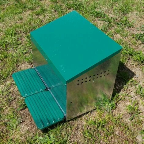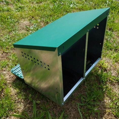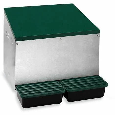 Pondoir pour poule en métal constitué de deux nichoirs avec entrée à l’intérieur et bacs de récupération des œufs à l’extérieur. Dimensions : L53 x l52 x H48 cm Structure en métal galvanisé Fonds en plastique avec bacs de récupération Toit peint en vert Conçu pour être accroché à une paroi ou monté sur des pieds Marque : Gaun