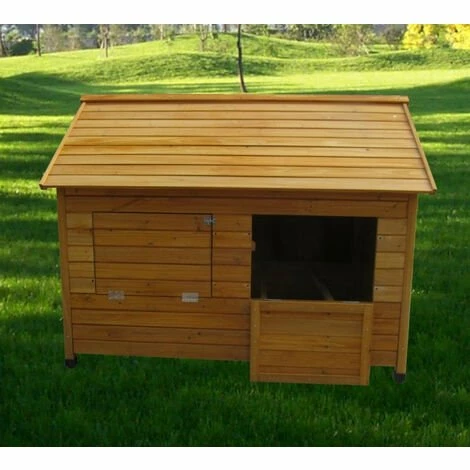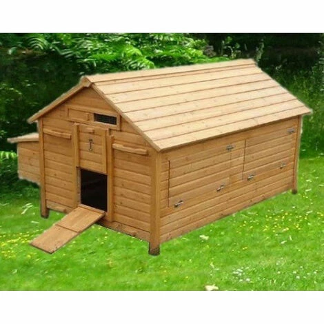 Découvrez le grand poulailler Challans, il sera parfait si vous recherche un abri à poules spacieux, très bien équipé et évolutif. En effet, vous pourrez compléter son équipement au besoin en ajoutant un ou deux pondoirs, un kit roulettes, un portier électronique… Un grand poulailler robuste pouvant recevoir une quinzaine de poules Le Challans est un modèle simple mais redoutablement efficace. Il est composé de panneaux de bois épais de 12 mm, très simples à assembler. L’épaisseur de son bois de qualité garantie une excellente protection de vos animaux contre le froid et les intempéries. Sa toiture en double pente permet un meilleur écoulement de l’eau de pluie et ainsi une meilleure isolation de la partie nuit. Un abri à volailles possédant de nombreux accessoires Il est monté sur quatre pieds, ce qui a pour effet d’écarter la plateforme principale du sol et de son humidité et donc d’améliorer encore l’isolation de l’intérieur. Ces pieds sont recouverts de capuchons de plastique qui empêchent les infiltrations dans les montants de bois épais (25 par 30 mm). Les volailles accèderont à la partie à l’aide d’une rampe et y trouveront 4 grands perchoirs où elles pourront s’installer. Vous accèderez facilement à cette partie grâce à la grande porte qui se trouve à l’arrière du Challans. Le large pondoir, séparé en 4 zones de nidification où vos pondeuses se relaieront pour pondre, est accessible de l’extérieur pour une récolte facilitée. Notez qu’un tiroir à déjections en métal galvanisé vous facilitera grandement la corvée de nettoyage. Couvrez-le de litière ou bien de papier journal pour que son entretien soit très rapide. Un équipement que vous pourrez facilement compléter Pratique et équipé de nombreux accessoires, le Challans est de plus personnalisable de plusieurs manières. Il est d’ailleurs proposé en trois finitions : toit bois (celui-ci), toit en shingle noir et toit en shingle vert. Ajoutez des pondoirs pour recevoir plus de bêtes Vous constaterez que des emplacements sont prévus pour pouvoir ajouter jusqu’à deux pondoirs supplémentaires (réf : C-5078E) sur le côté qui n’en possède pas encore. Vous décuplerez ainsi votre capacité. Rendez votre poulailler mobile Un kit roulettes (réf : KITROUEL) très simple à installer rendra votre poulailler très facilement transportable. Ses poignées de portage situées sur les faces avant et arrière seront alors très utile pour le manipuler. Automatisez l’ouverture de sa porte Enfin, la porte de la partie nuit peut être équipée d’un portier électronique. Il faudra dans l’idéal remplacer la porte en bois par une trappe en métal de taille M (réf : mHS-trappe) qui donnera de biens meilleurs résultats couplée au portier. N’oubliez pas de protéger la zone qui se trouve tout autour de votre poulailler avec un filet ou un grillage à poules avant de les laisser gambader !
