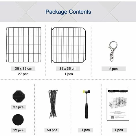 - L’ASSEMBLAGE EST UN JEU D’ENFANT: Il suffit de connecter les 27 panneaux grillagés métalliques et 1 porte à l’aide des 37 connecteurs. Et puis votre chien peut jouer danc ce parc spacieux