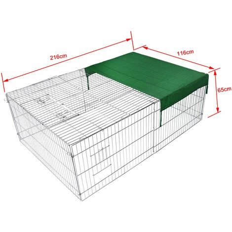 La construction solide en métal chromé dispose de 4 portes d’entrée et d’une taille totale de 216 x 116 x 65 cm. Y accéder est très simple. L’enclos se verrouille de manière sûre. Par ailleurs, l’enclos est muni d’un toit grillagé, qui protège vos animaux des prédateurs et de d’autres dangers éventuels. Plus besoin de les surveiller en permanence. La cage est munie également d’une bâche qui les protégera des rayons de soleil et leur offrira un endroit à l’ombre, qui sera le bienvenu par les jours de grande chaleur.