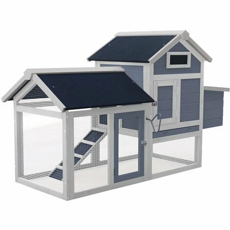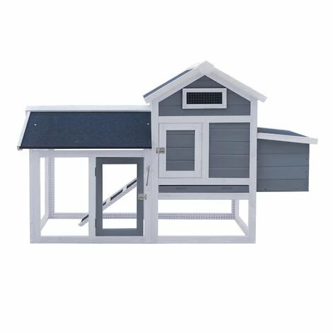 La structure du poulailler est en bois de sapin, peint en gris et blanc. La structure en bois est recouverte d’un grillage galvanisé résistant aux intempéries. Le toit est doté d’une isolation en bitume qui protège les animaux de la pluie.
