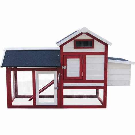 La structure du poulailler est en bois de sapin, peint en rouge et blanc. La structure en bois est recouverte d’un grillage galvanisé résistant aux intempéries. Le toit est doté d’une isolation en bitume qui protège les animaux de la pluie.